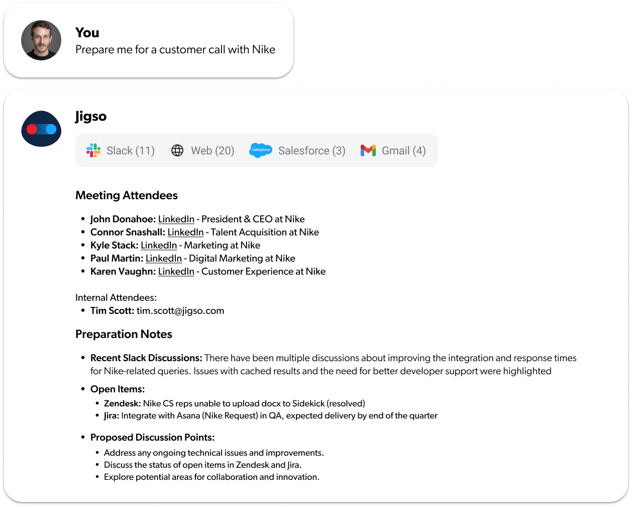 With Jigso, sales teams eliminate busywork and focus on what matters—building relationships and closing deals. Automated meeting prep, comprehensive deal intelligence, and proactive pipeline alerts ensure nothing falls through the cracks .
