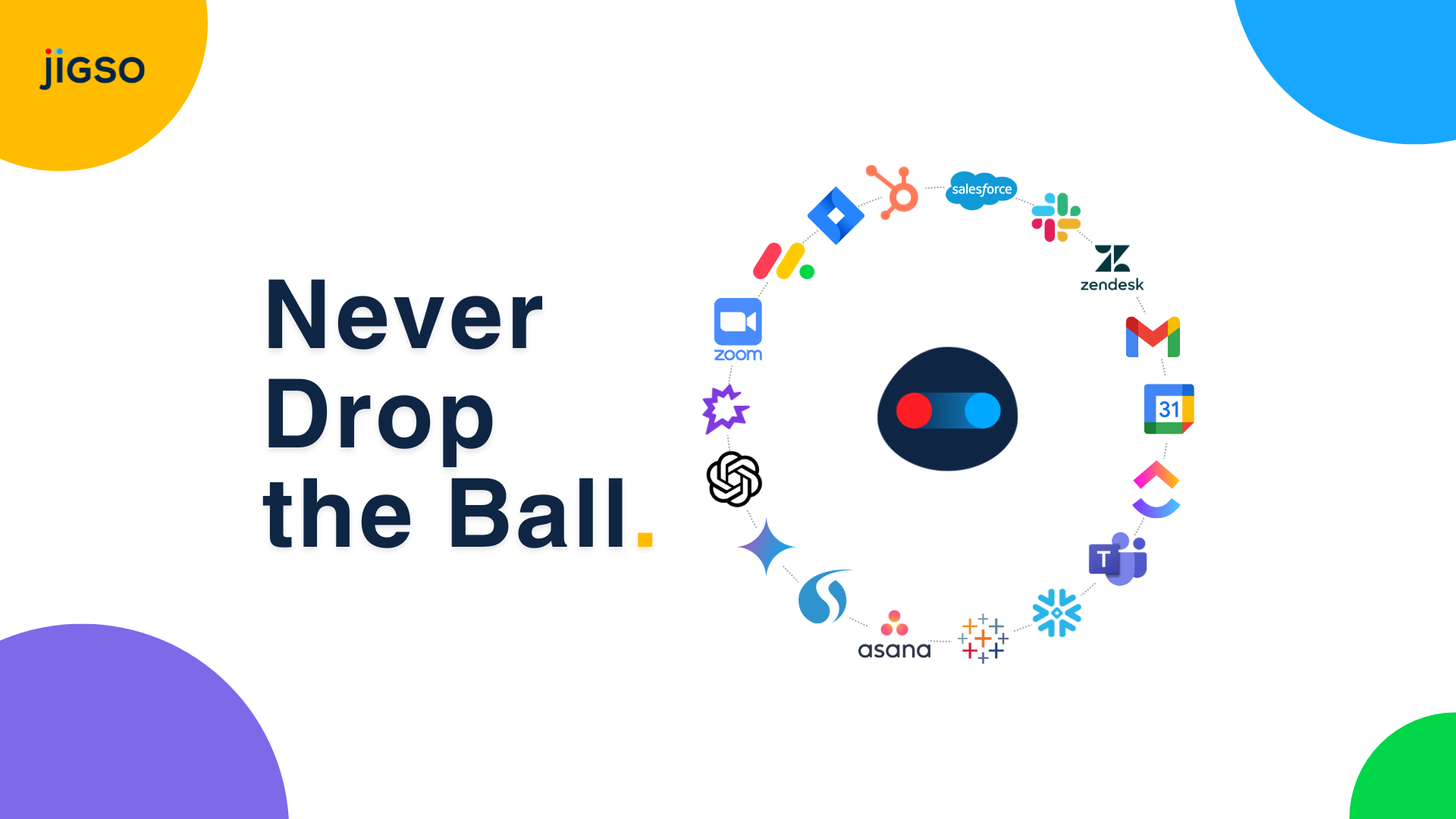 The above image represents just a few core systems and apps Jigso connects to. Plug Jigso in to all your apps such as Slack, Salesforce, Hubspot, Jira, Zendesk, as well as google drive docs and put your new AI sidekick to work.